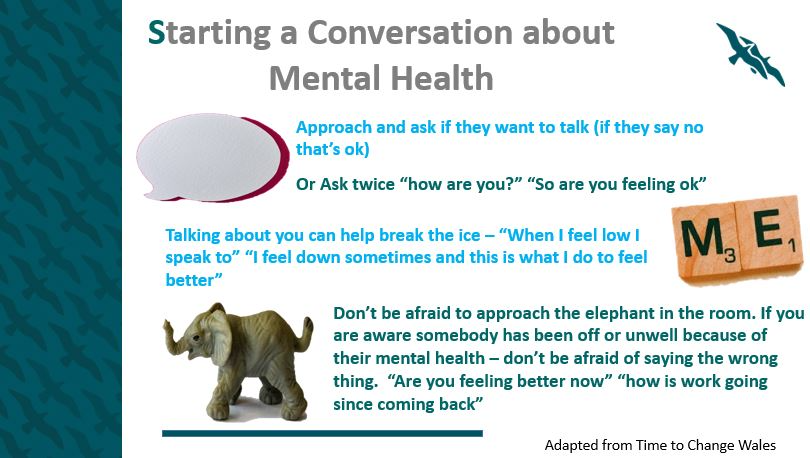 Ystyriodd y tîm, os gallwn ni edrych ar sefyllfaoedd a phobl eraill mewn ffordd wahanol a cheisio dechrau sgwrs, hyd yn oed os yw hynny ond yn golygu gofyn i rywun ‘sut ddiwrnod gest ti’, ‘sut wyt ti'n teimlo’, gallwn ddysgu mwy am yr hyn sy'n digwydd ym mywyd yr unigolyn hwnnw a beth y gallwn ni ei wneud i'w gefnogi. Yna, ystyriodd y sesiwn y ffyrdd y gallwn gael sgwrs am iechyd meddwl gyda ffrindiau, teulu, cydweithwyr ac eraill, a chyngor defnyddiol ar ddechrau'r sgyrsiau hyn a chymryd rhan ynddyn nhw. Yna, gwnaethon ni ddod â'r sesiwn i ben drwy wneud gweithgareddau ymlacio ac anadlu er mwyn ein helpu i fyfyrio ychydig ar ein diwrnod.